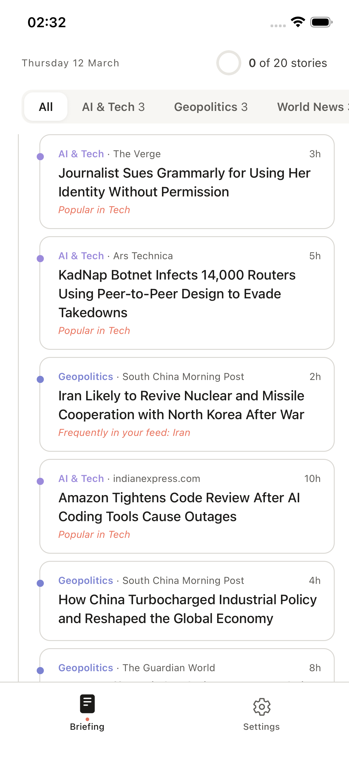 Every morning, 20 stories — curated overnight, ranked for you. No algorithm chasing your outrage. No infinite scroll. A briefing you can actually finish.